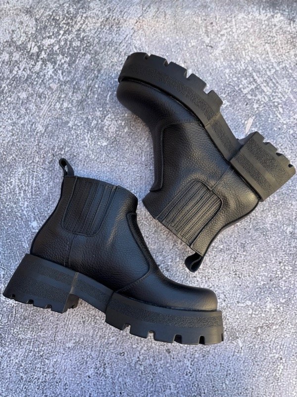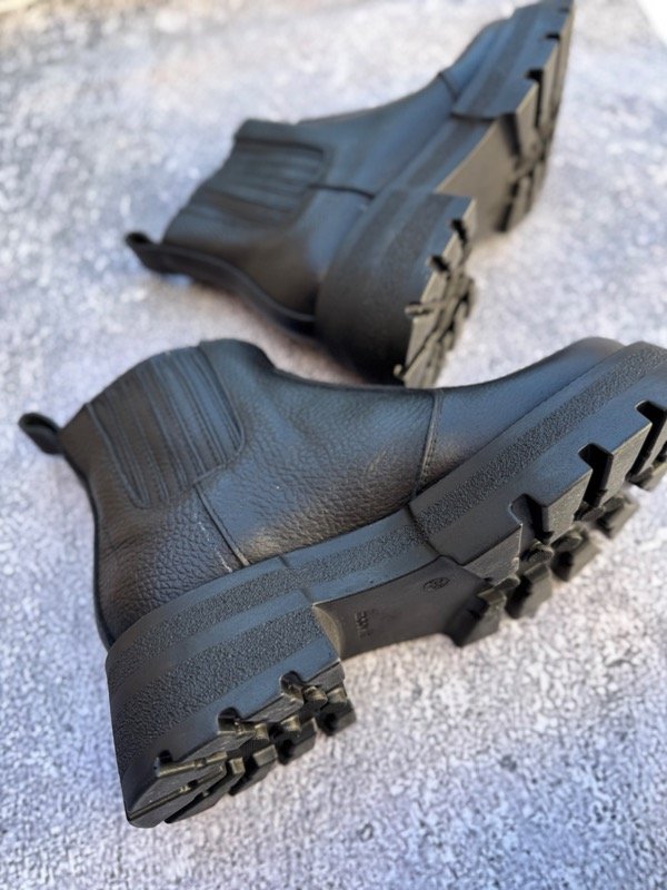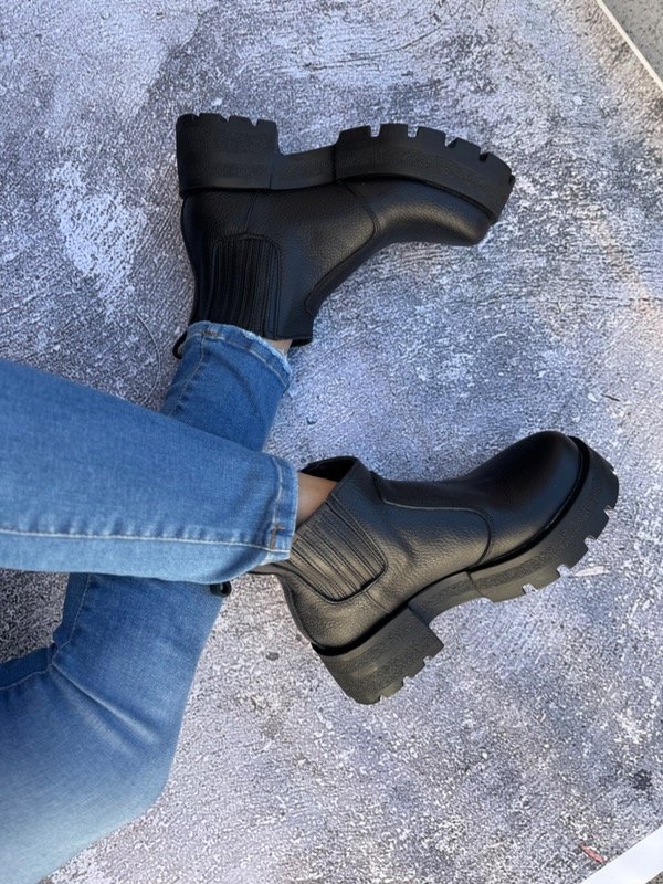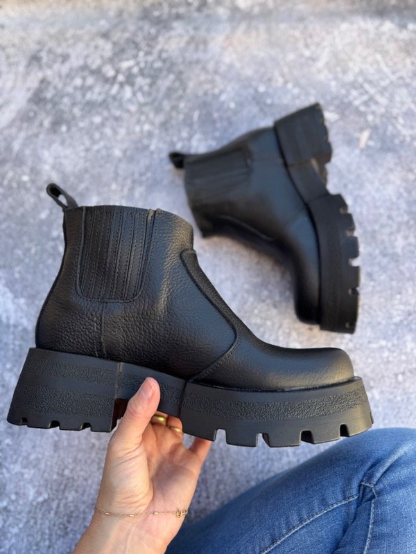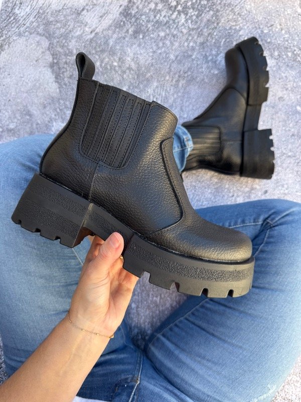 Bota Emma en cuero graneado, forradas en cuero en su interior, con elástico en laterales, forrados con recorte en cuero. Base hiper liviana con taco cómodo y base de apoyo. Es un bota Clásica con un toco moderno gracias a su base.