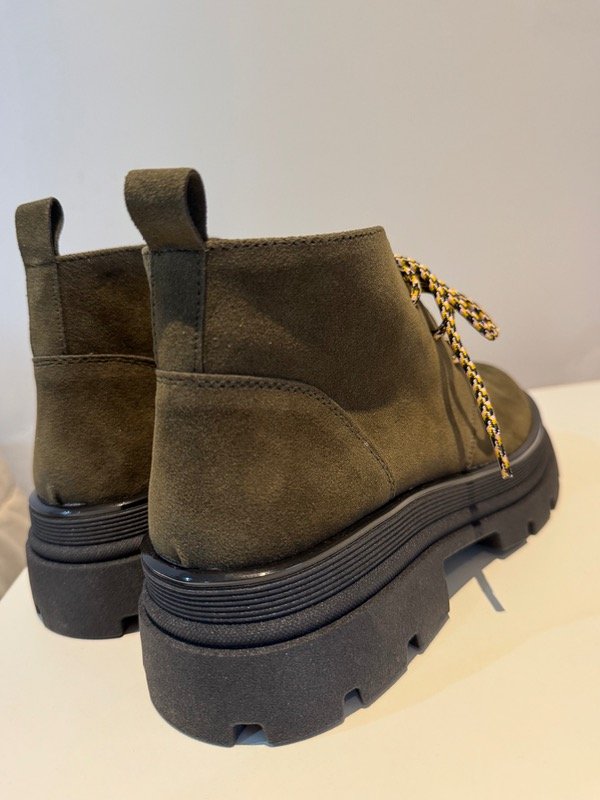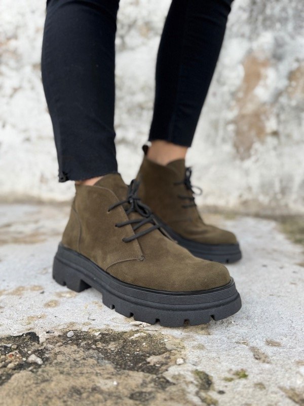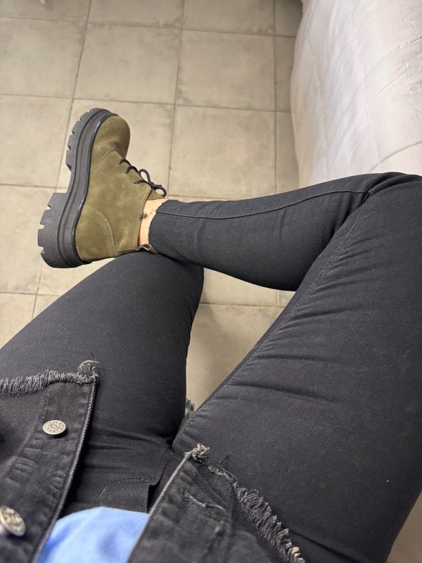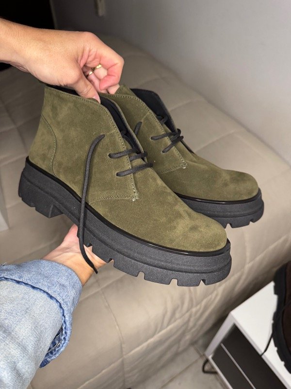 Botas en gamuzon, color oliva, forradas en su interior, con una base de PU liviana. Lindos, cómodos y súper fiel. El envió gratis es a sucursal cercana al domicilio.